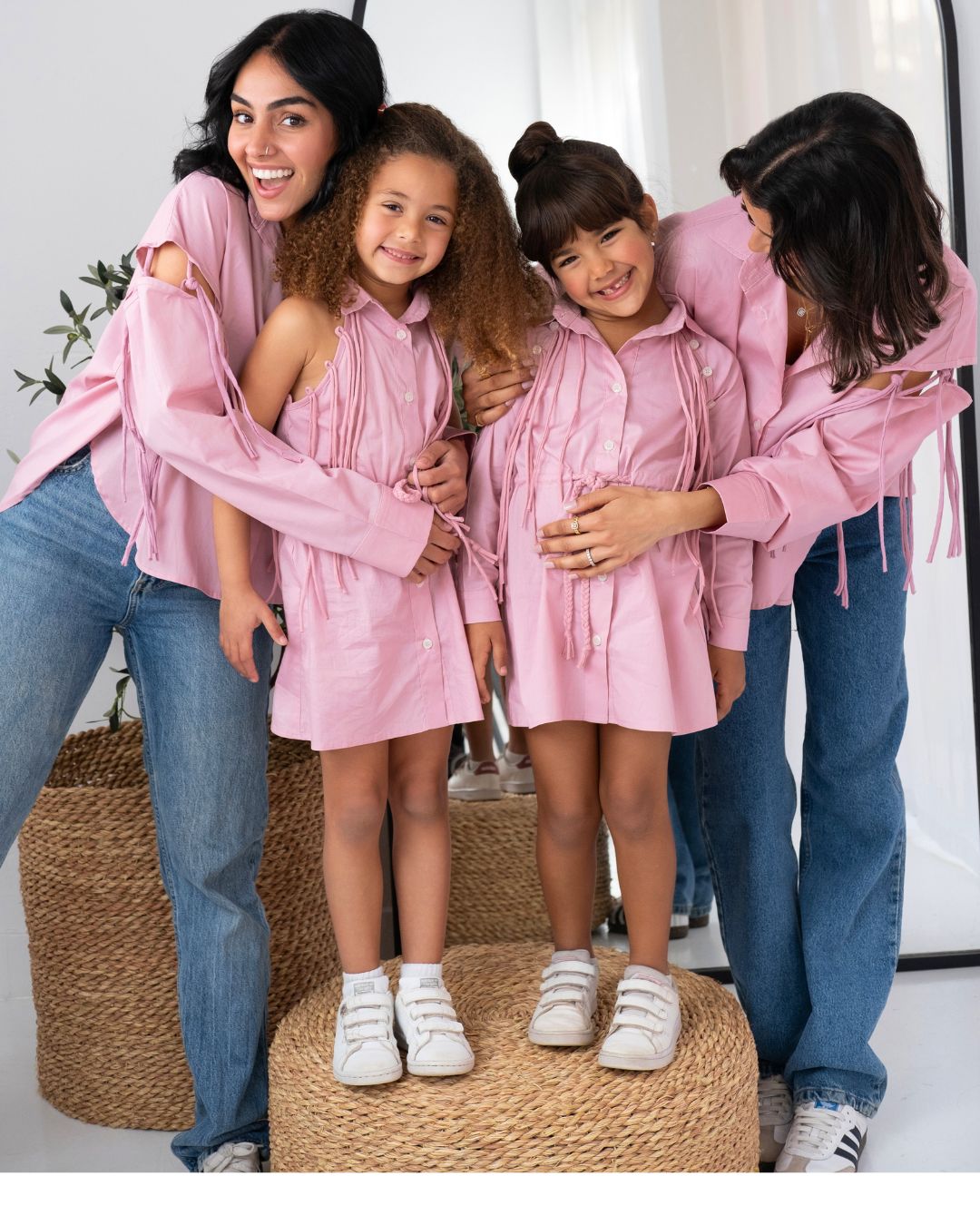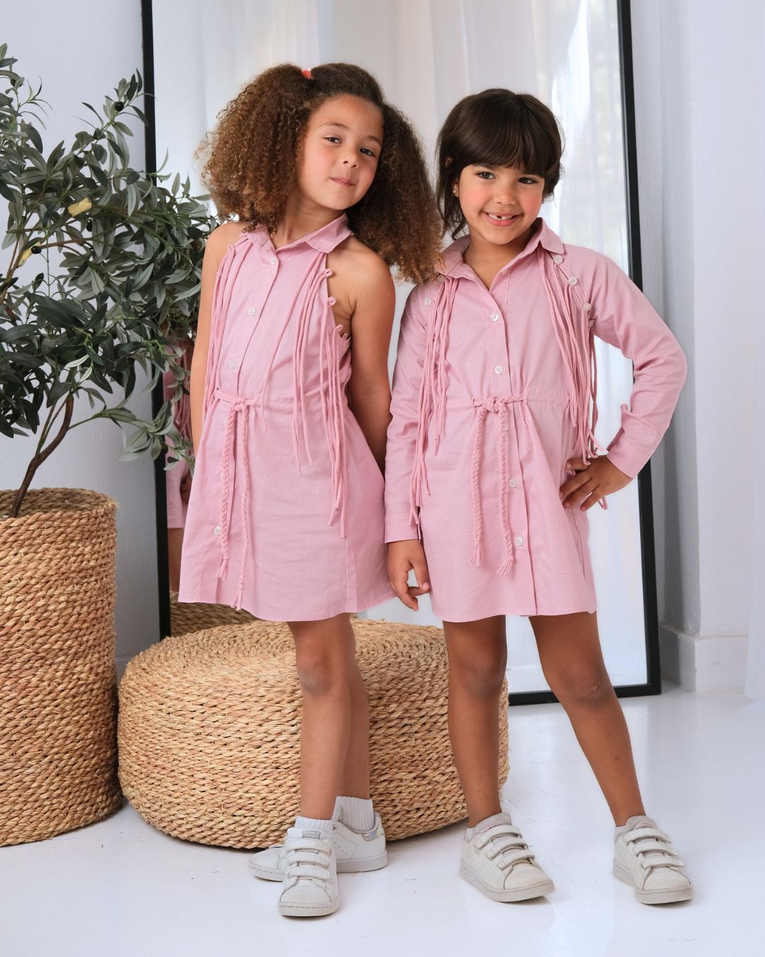 You can wear it as a fitted long sleeve shirt dress with fringe at the shoulders or you can unbutton the sleeves and transform it into a halter neck shirt dress with loop and tassel detailing.
