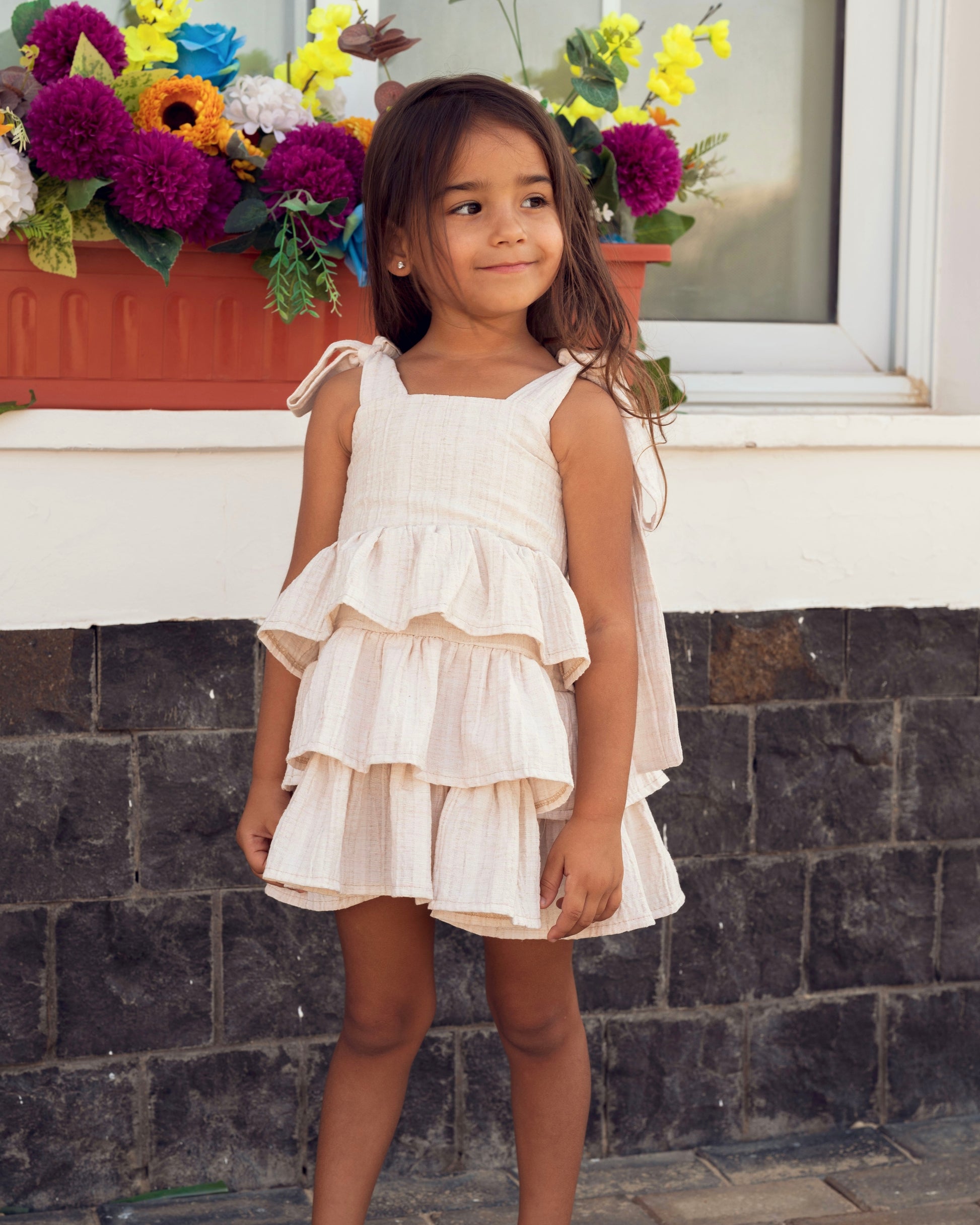 A soft pink dress with delicate ruffles and criss-cross tie-back straps. Comfortable, twirl-ready, and perfect for any occasion.